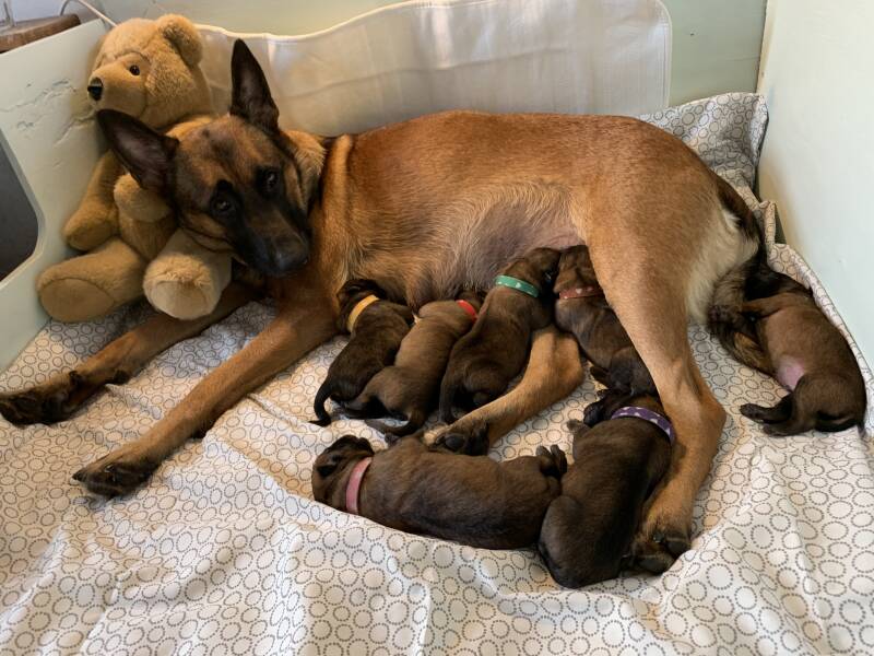 Saar is moeder geworden van 8 pups, waarvan 4 teven en 4 reuen. Een teefje is gestroomd (Hollandse herder aftekening zoals vader) en alle andere pups zijn Mechelse herder aftekening net als moeder.