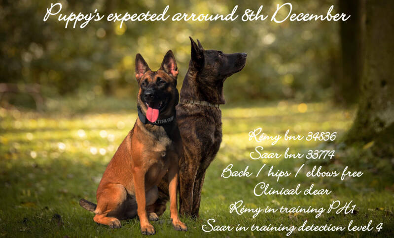Saar is moeder geworden van 8 pups, waarvan 4 teven en 4 reuen. Een teefje is gestroomd (Hollandse herder aftekening zoals vader) en alle andere pups zijn Mechelse herder aftekening net als moeder.